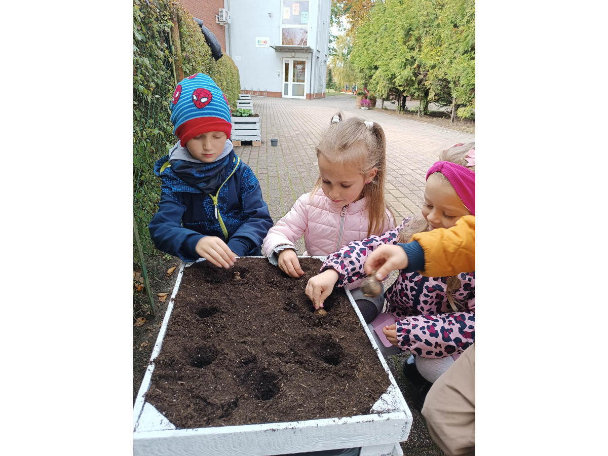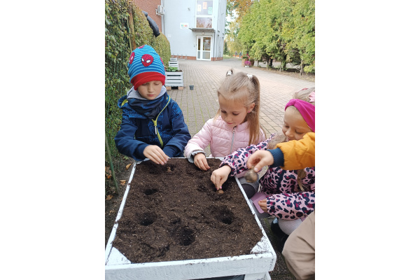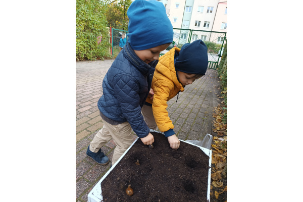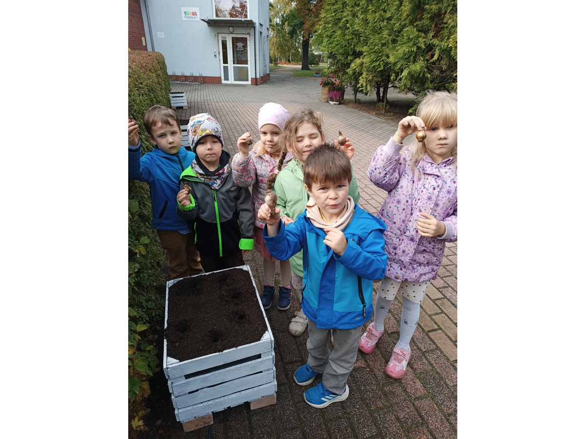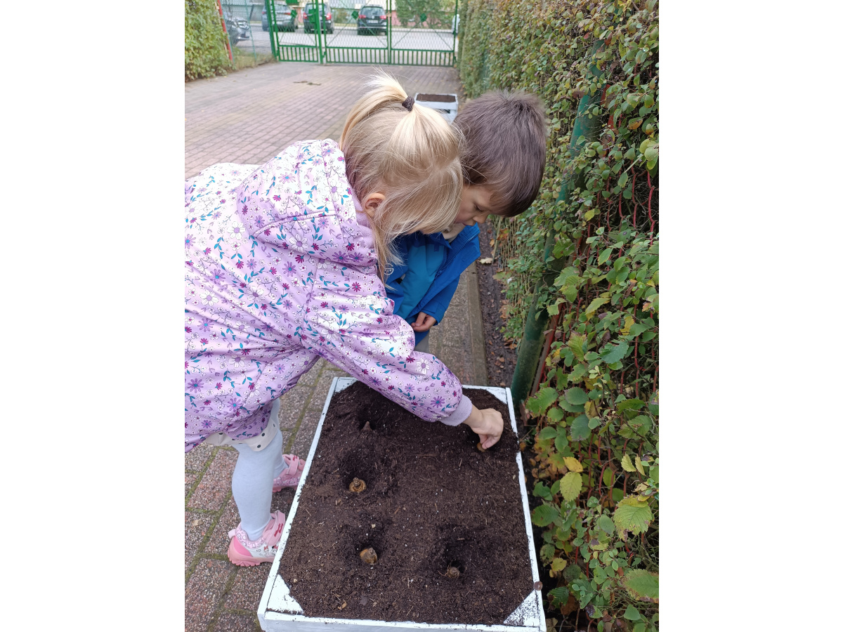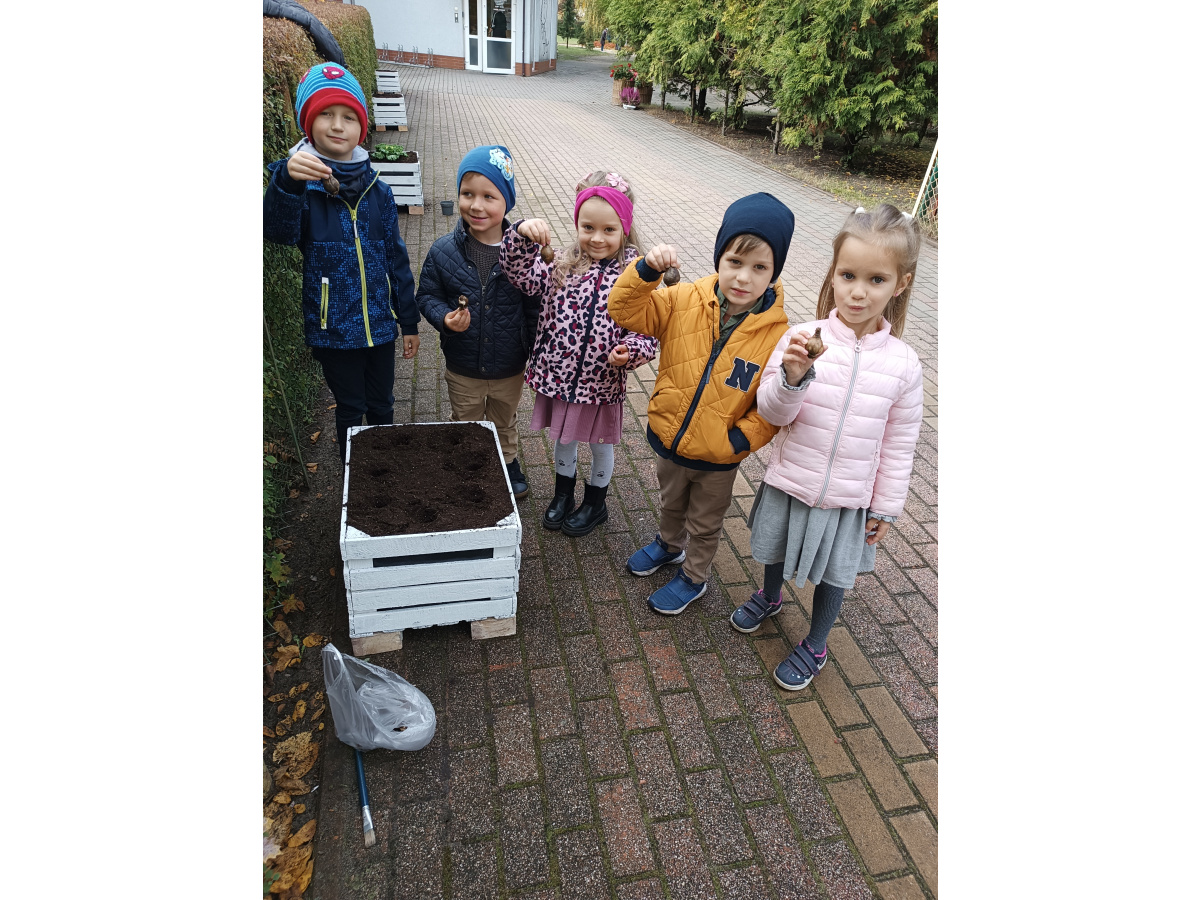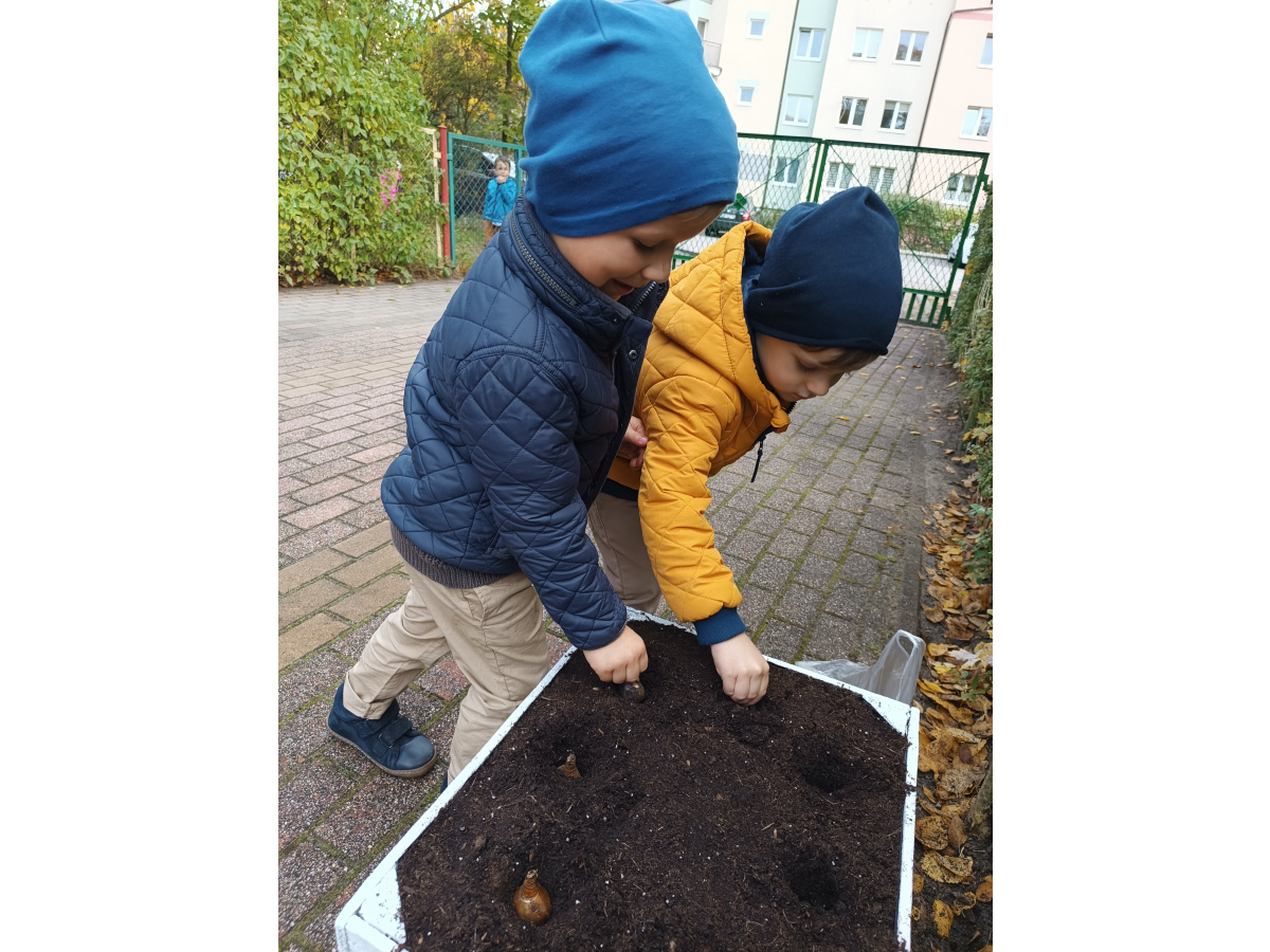 Dnia 9 października 2025r dzieci z grupy "Pszczółki " posadziły do przygotowanych skrzynek cebulki żonkili. Rośliny zakwitną na wiosnę tworząc " Pola Nadziei". Mają one nam przypominać o ludziach cierpiących i oczekujących naszej opieki. "Pola Nadziei " to ogólnopolska kampania mająca na celu propagowanie idei wolontariatu i bezinteresownej pomocy chorym. Symbolem akcji jest żółty żonkil uznawany za międzynarodowy symbol nadziei.