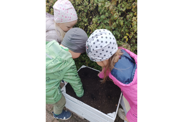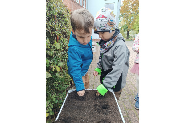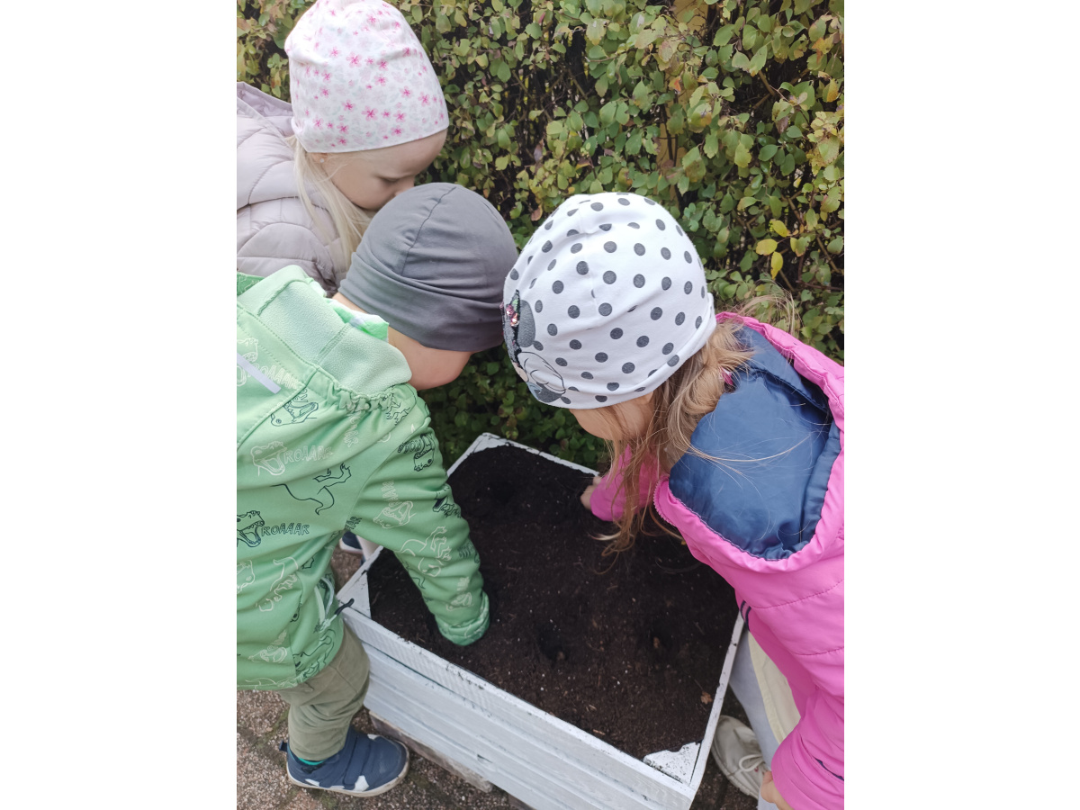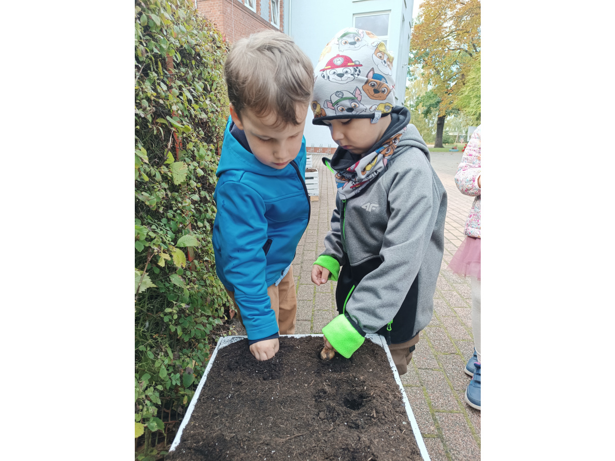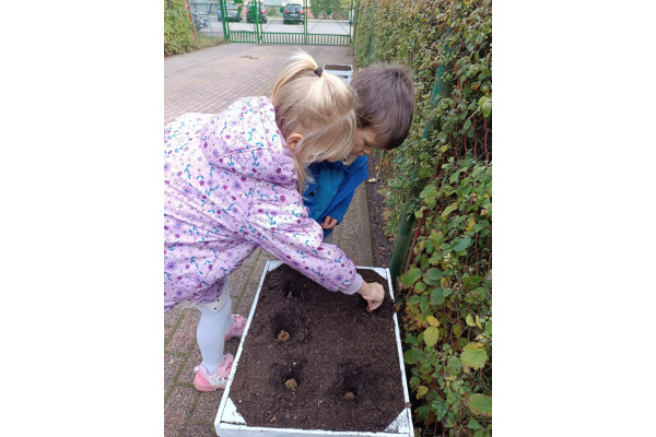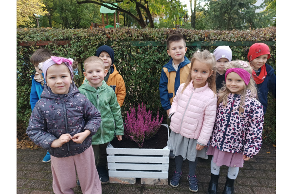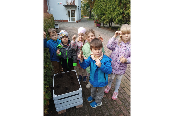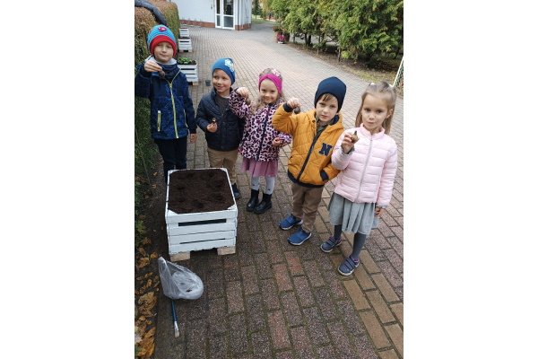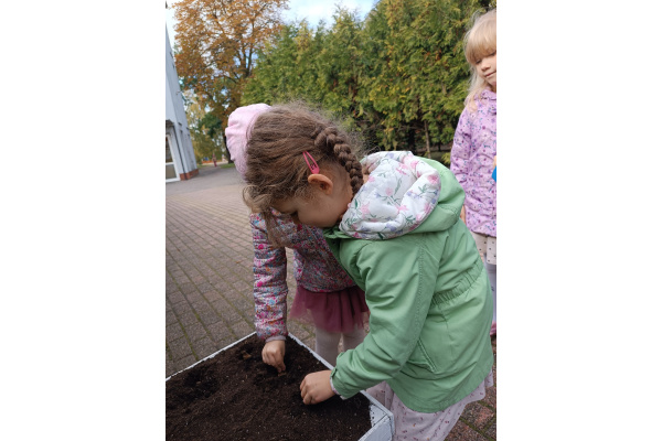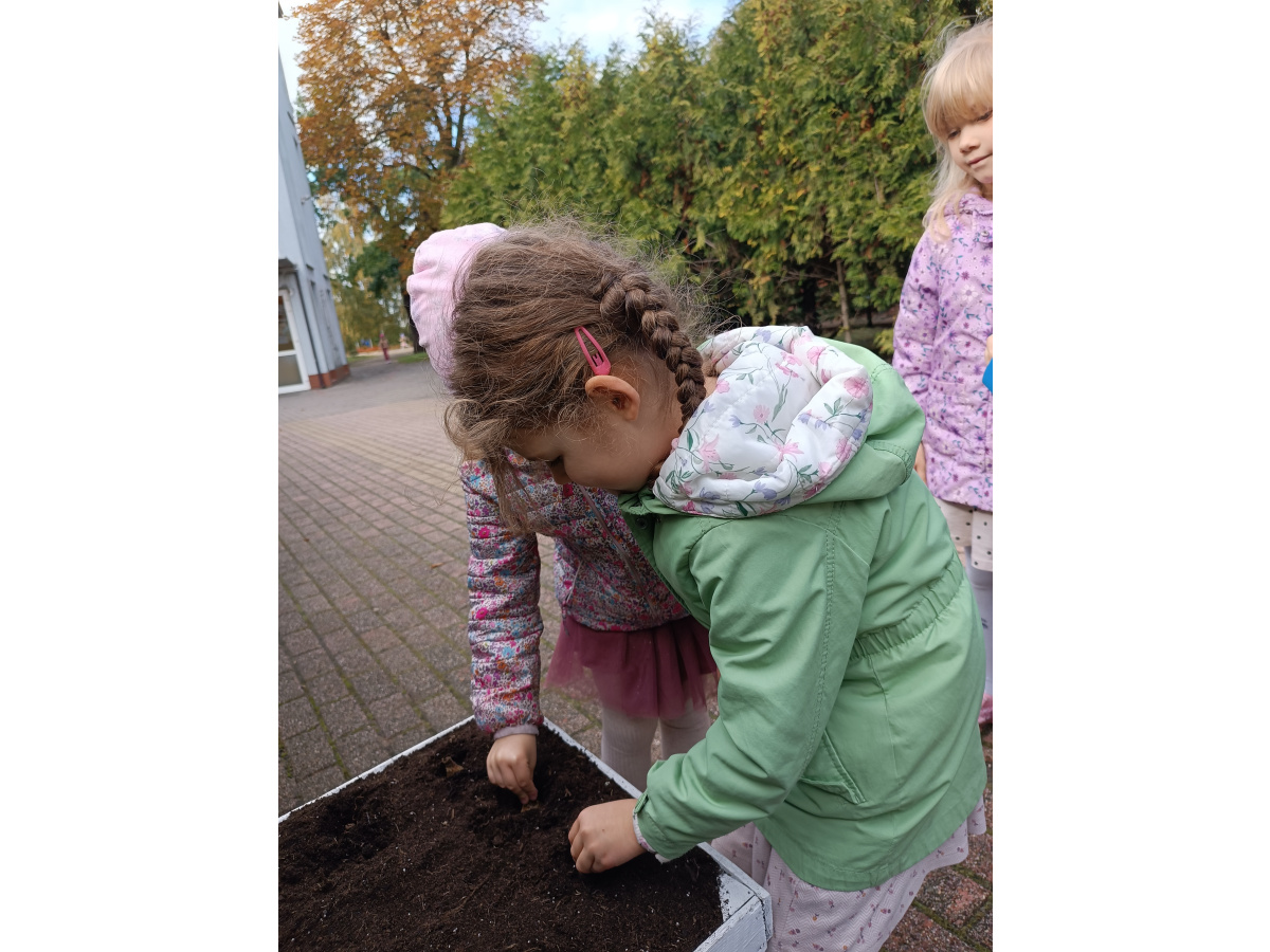 Dnia 9 października 2025r dzieci z grupy "Pszczółki " posadziły do przygotowanych skrzynek cebulki żonkili. Rośliny zakwitną na wiosnę tworząc " Pola Nadziei". Mają one nam przypominać o ludziach cierpiących i oczekujących naszej opieki. "Pola Nadziei " to ogólnopolska kampania mająca na celu propagowanie idei wolontariatu i bezinteresownej pomocy chorym. Symbolem akcji jest żółty żonkil uznawany za międzynarodowy symbol nadziei.