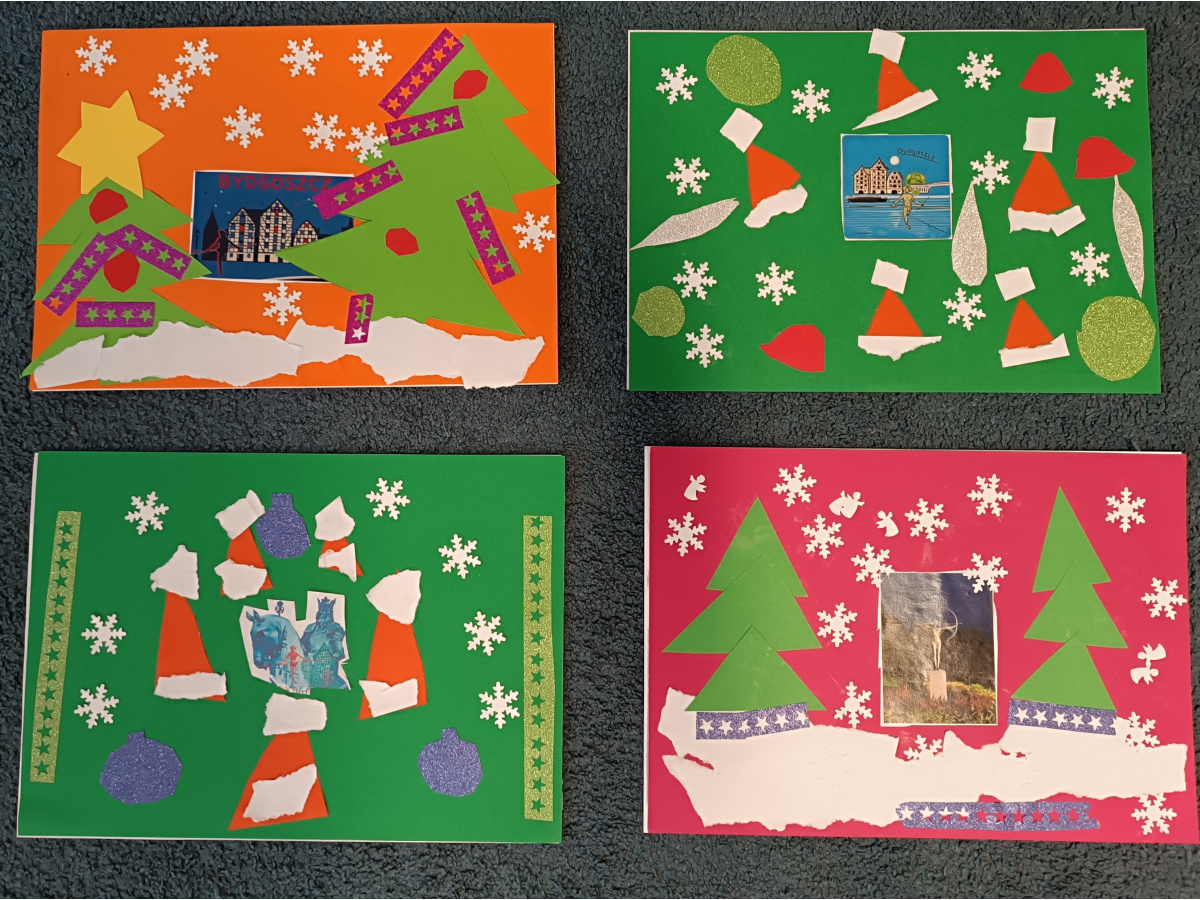 "Słoneczka" przygotowały projekty kartek świątecznych z motywami bydgoskimi, aby wziąć udział w miejskim konkursie plastycznym.
