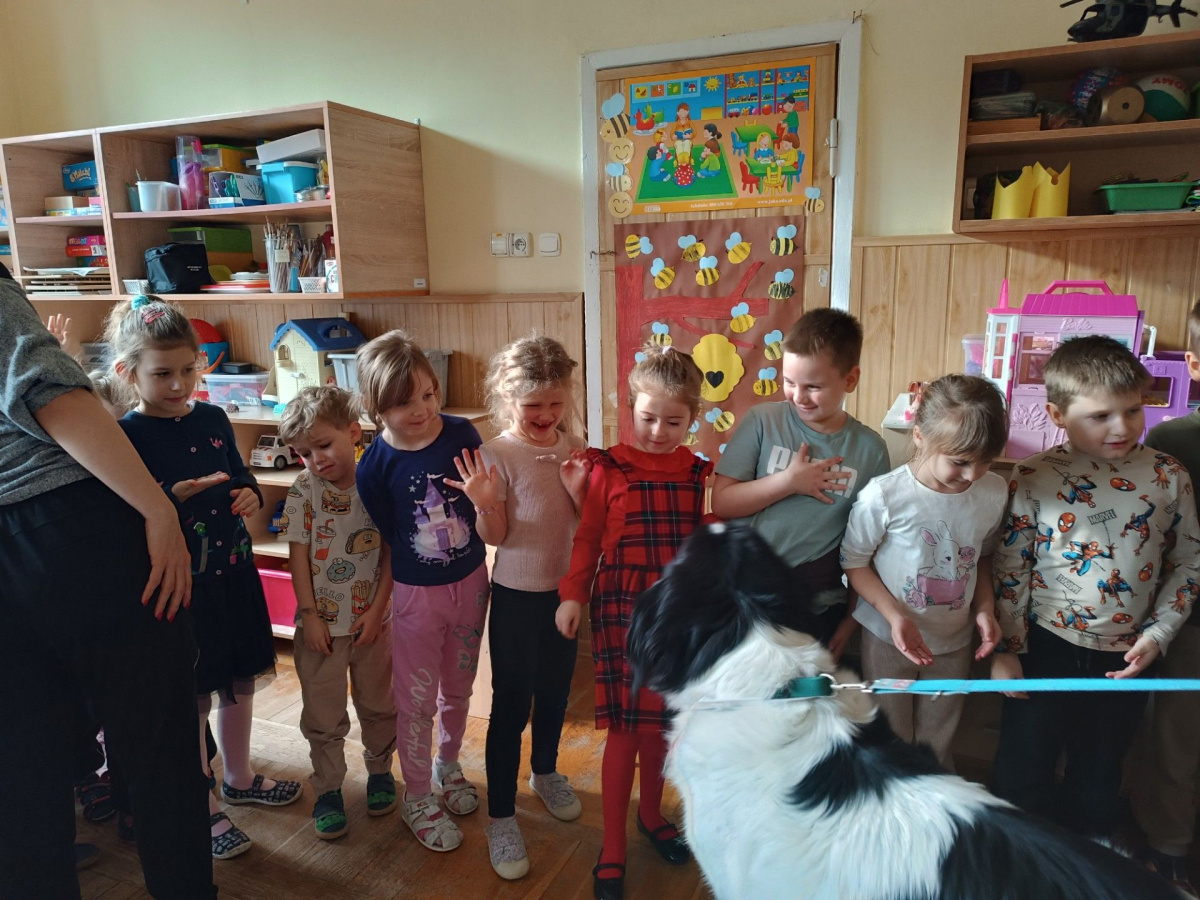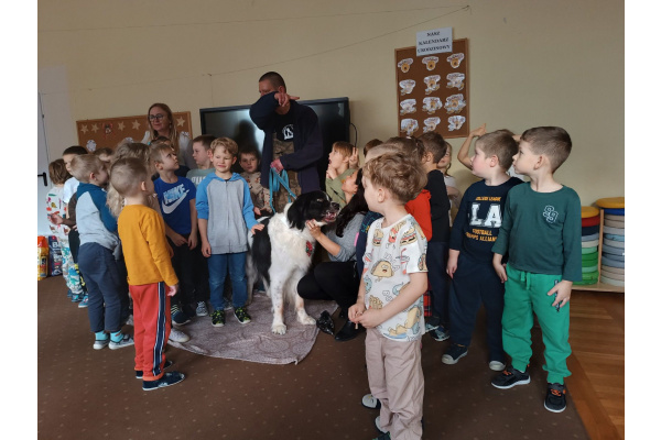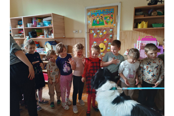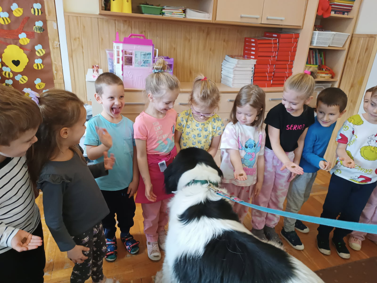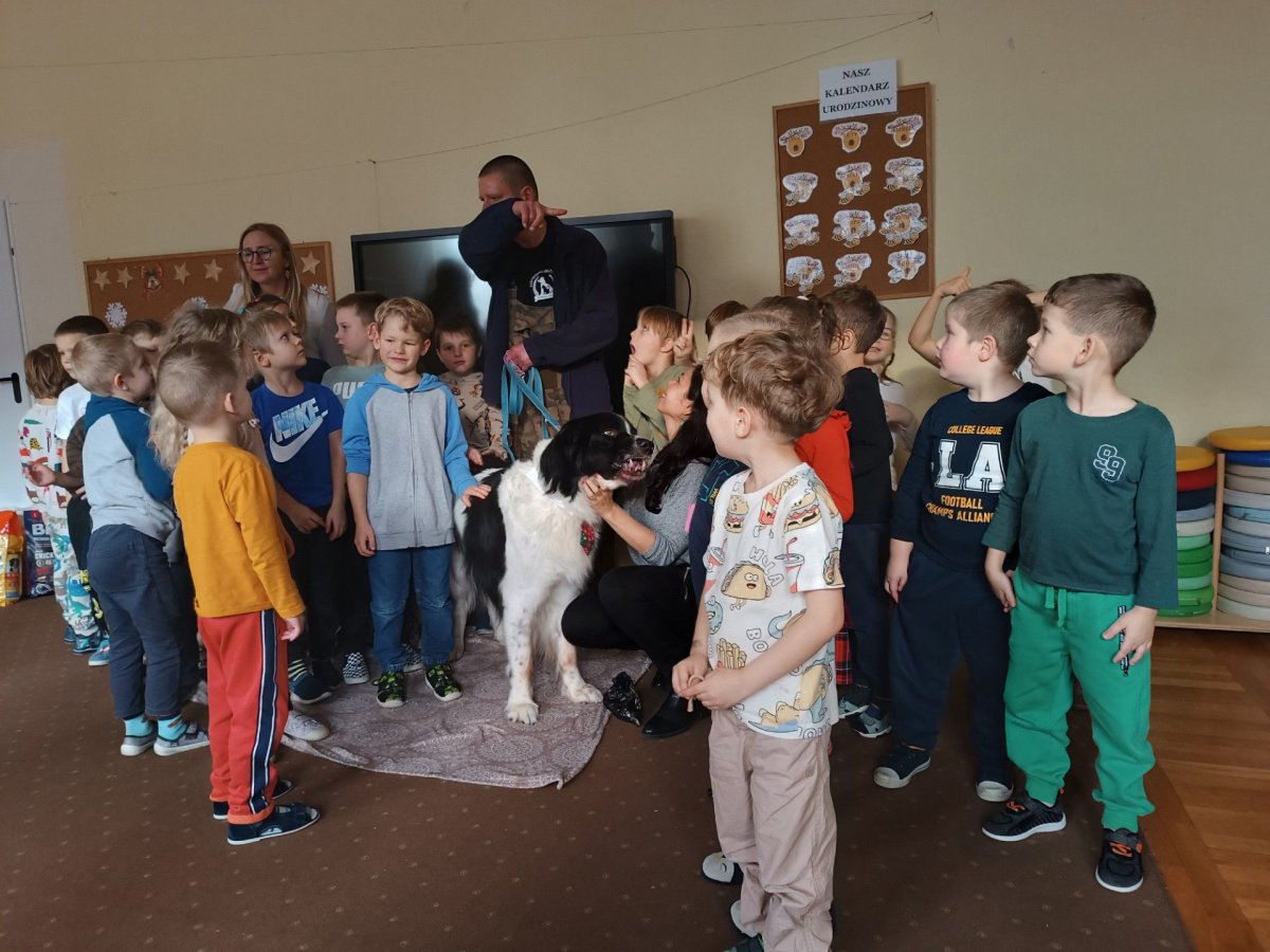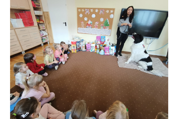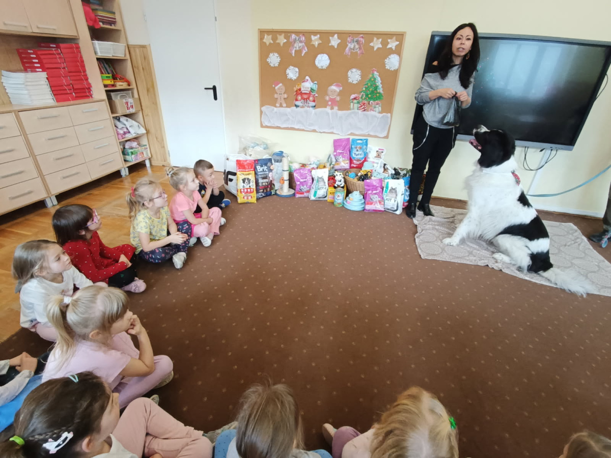 Dzisiaj tj. 10 XII 2025r w naszym przedszkolu miało miejsce spotkanie z przedstawicielami bydgoskiego Schroniska dla zwierząt, panią Darią Pilewską i Panem Marcinem. Dzieci dowiedziały się o zwierzętach mieszkających w schronisku, w jaki sposób możemy im pomóc oraz jaką rolę w życiu codziennym pełnią psy. Razem z gośćmi przybył do nas pies - landser Pedro, który sprawił dzieciom wiele radości. Dzieci przekazały naszym gościom karmę, koce, ręczniki, które zebrane zostały podczas zbiórki.