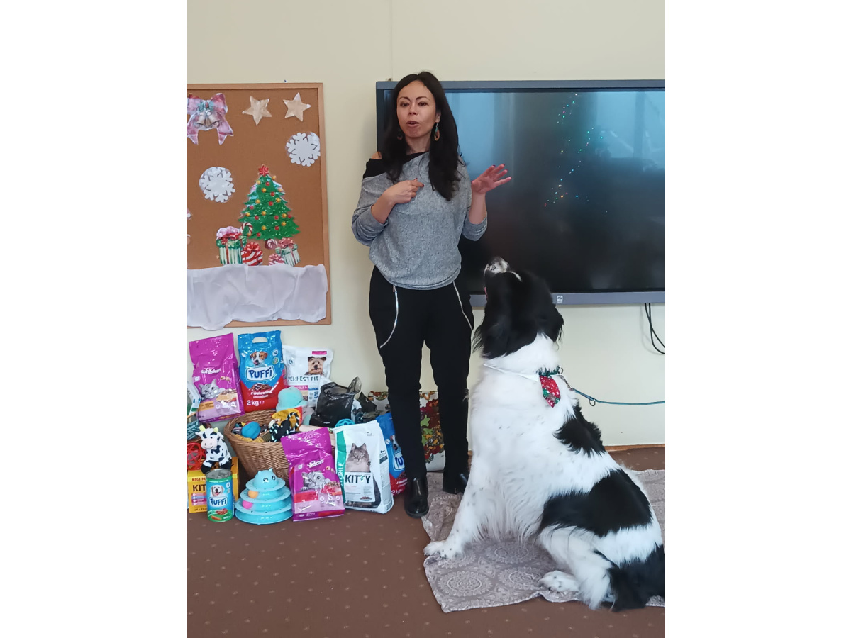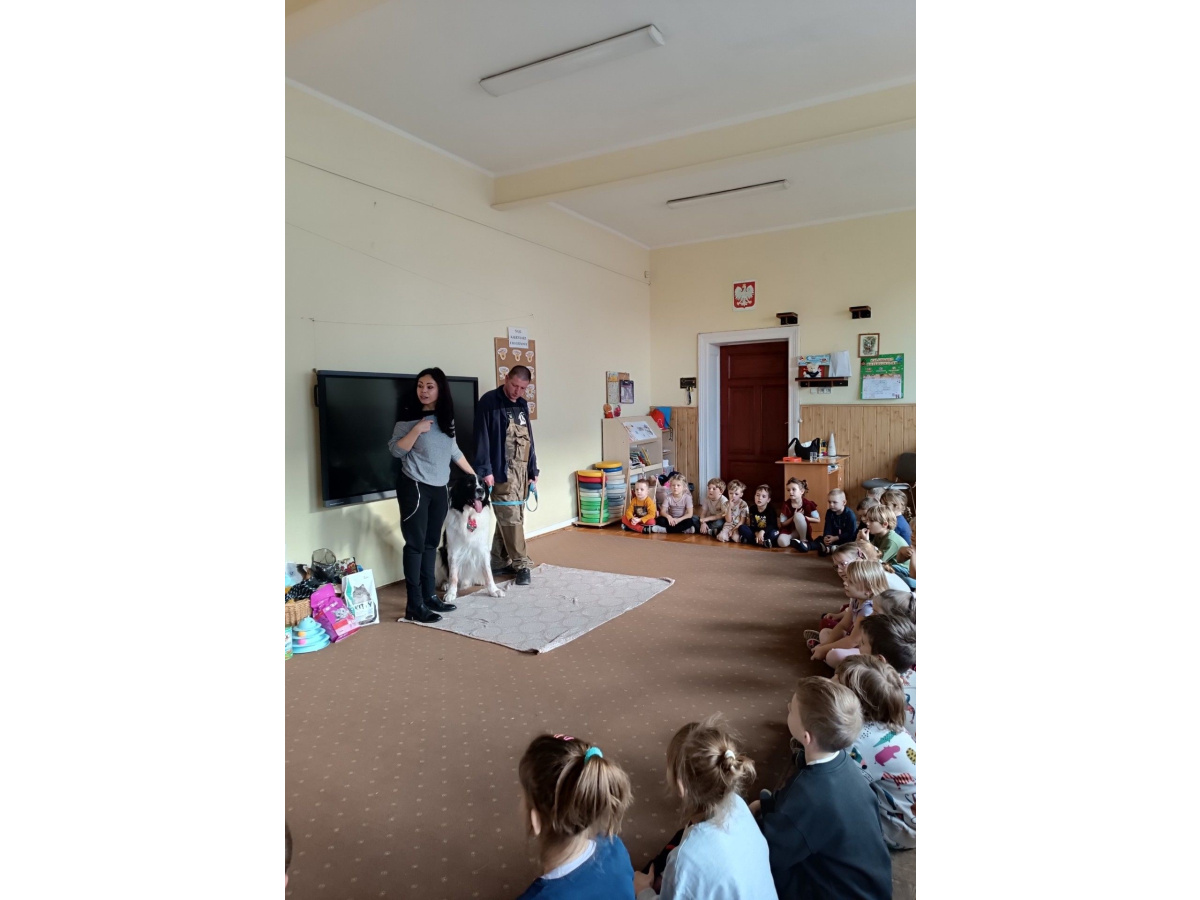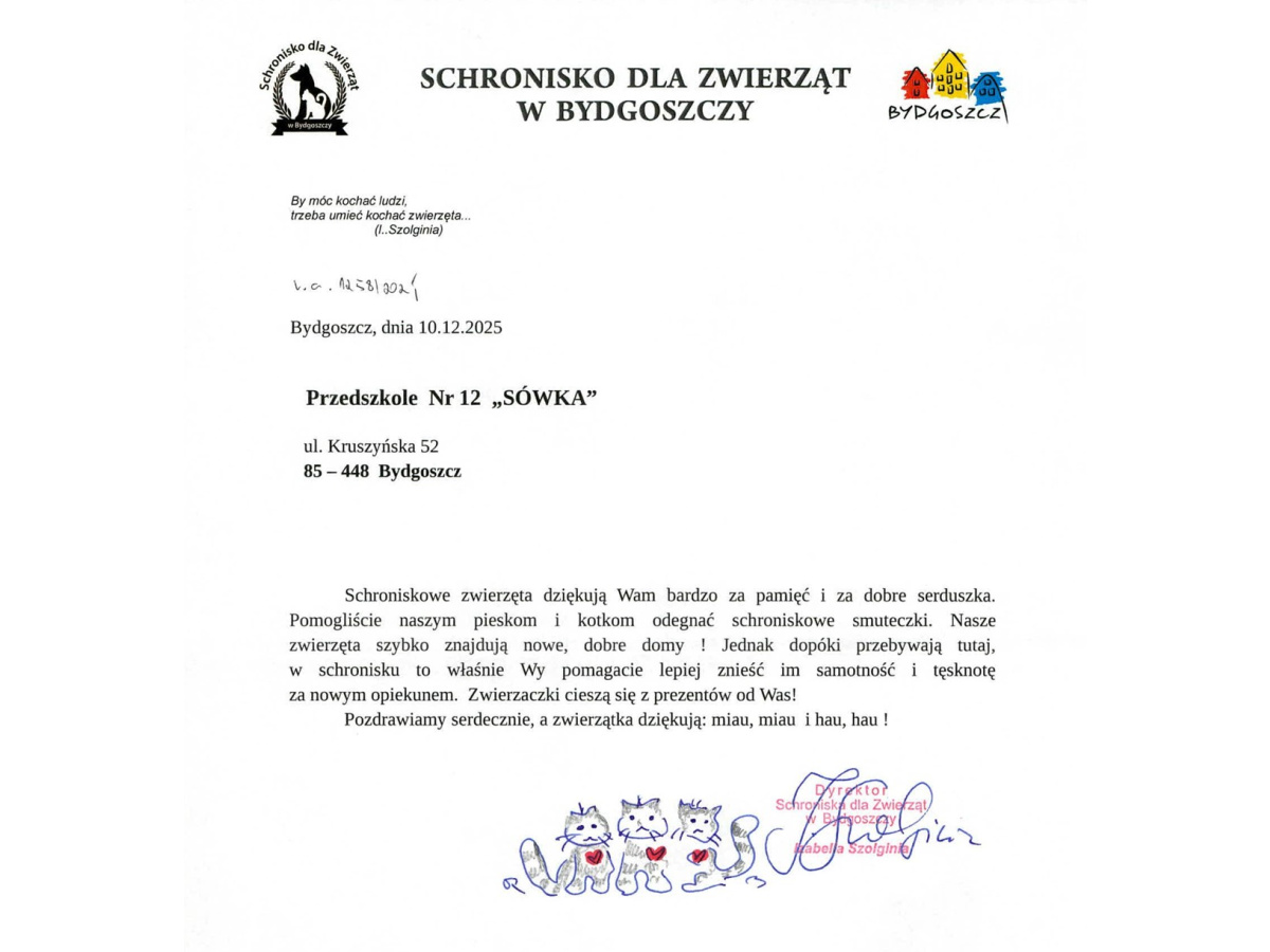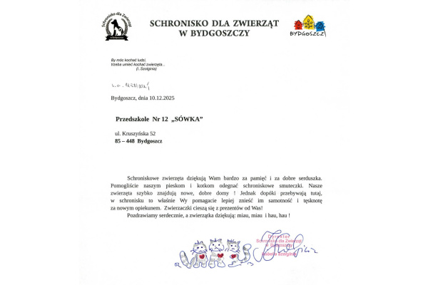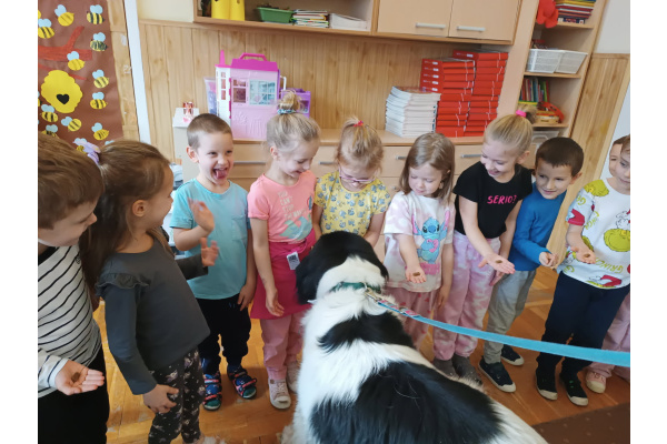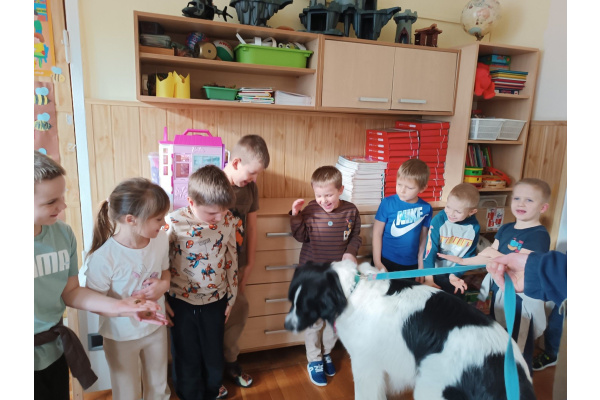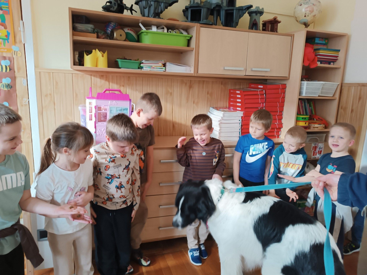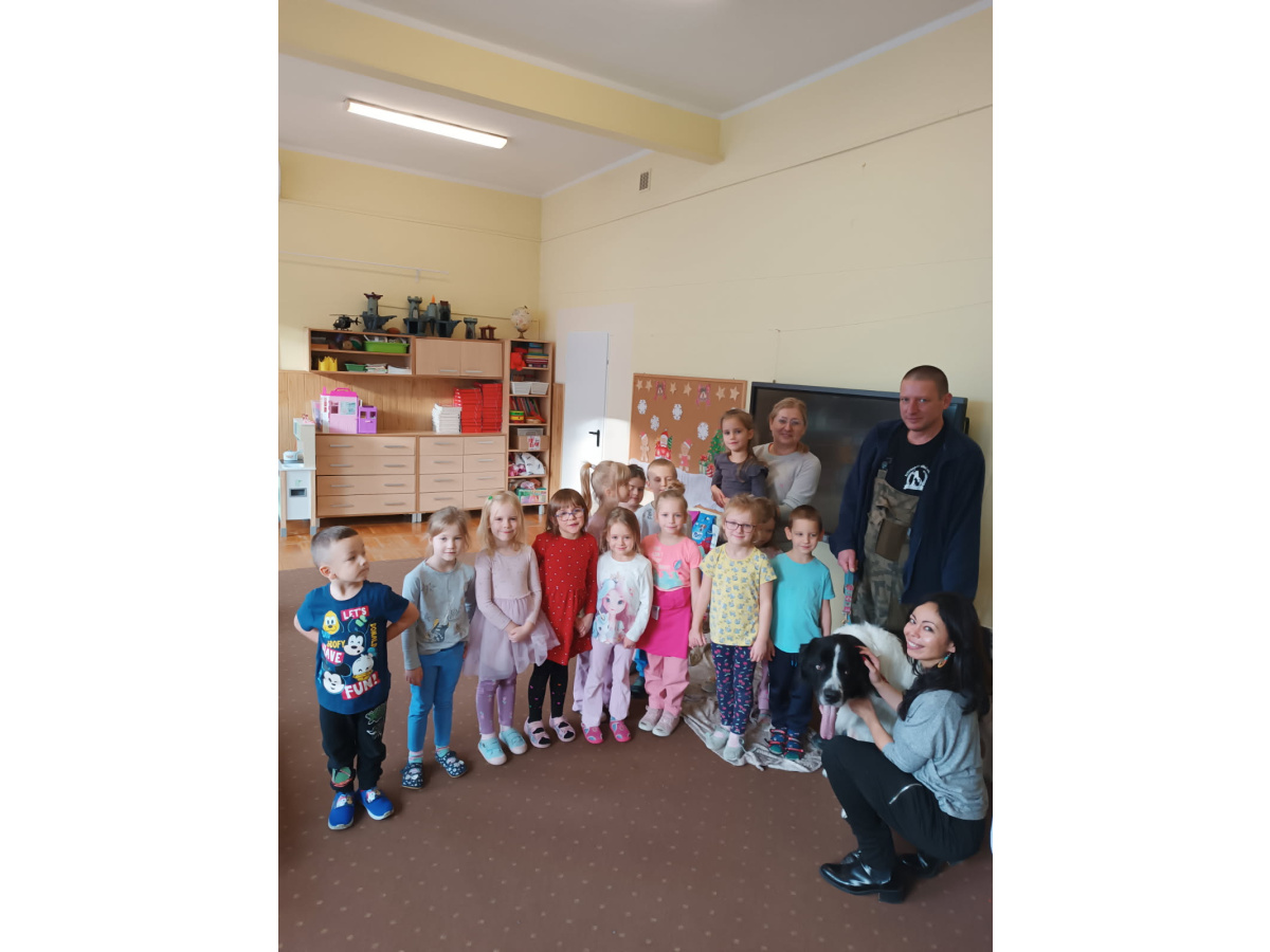Dzisiaj tj. 10 XII 2025r w naszym przedszkolu miało miejsce spotkanie z przedstawicielami bydgoskiego Schroniska dla zwierząt, panią Darią Pilewską i Panem Marcinem. Dzieci dowiedziały się o zwierzętach mieszkających w schronisku, w jaki sposób możemy im pomóc oraz jaką rolę w życiu codziennym pełnią psy. Razem z gośćmi przybył do nas pies - landser Pedro, który sprawił dzieciom wiele radości. Dzieci przekazały naszym gościom karmę, koce, ręczniki, które zebrane zostały podczas zbiórki.