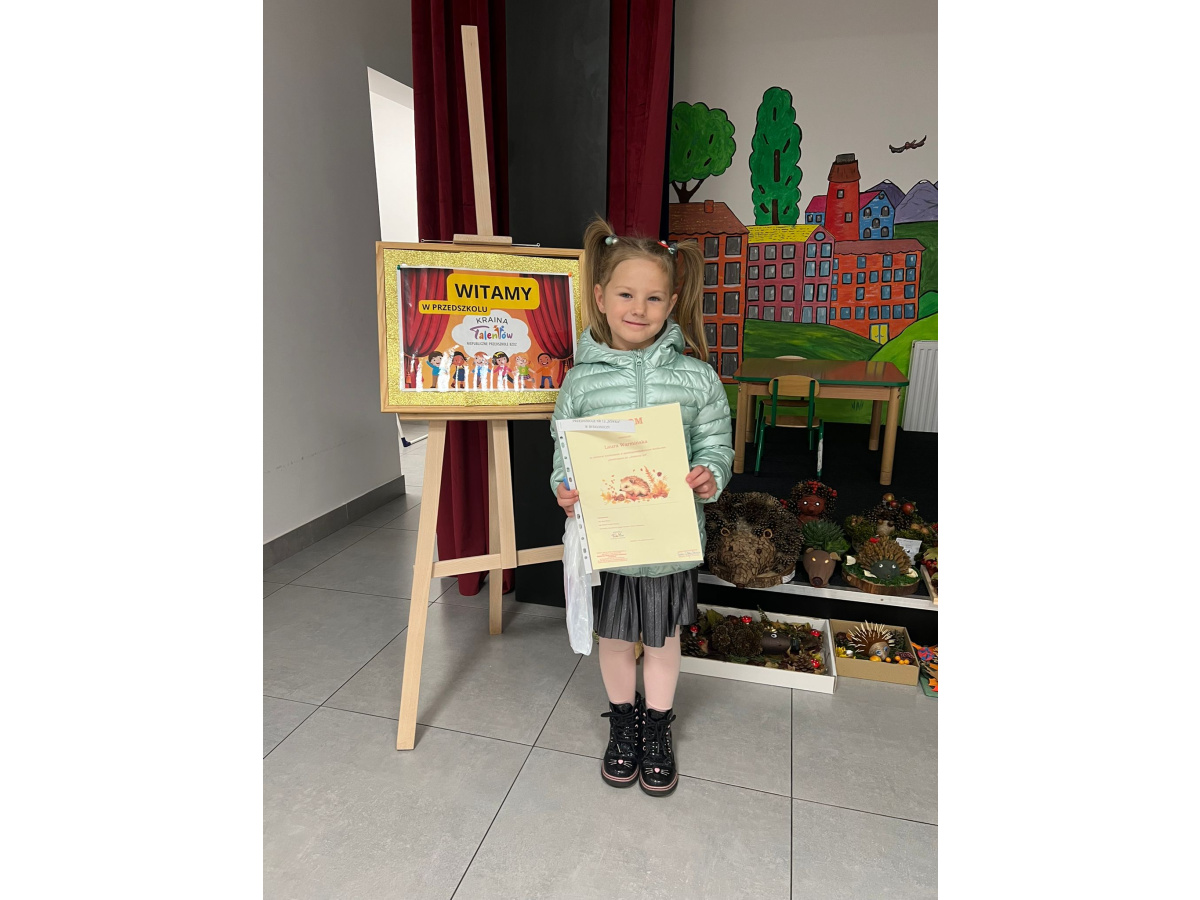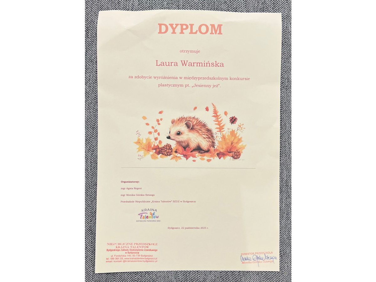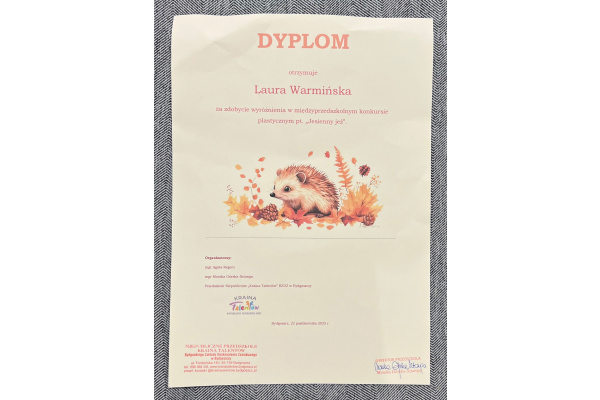 Przedszkolaki z "Sówki" wzięły udział w konkursie plastycznym pt. "JESIENN JEŻ", który został zorganizowany przez Przedszkole Niepubliczne "Kraina Talentów" w Bydgoszczy. Jedna z prac wykonanych przez "Słoneczka" zdobyła szczególne uznanie konkursowego jury. Serdecznie gratulujemy Laurze oraz wszystkim dzieciom, które wykonały równie piękne, jesiennie kolorowe prace.
