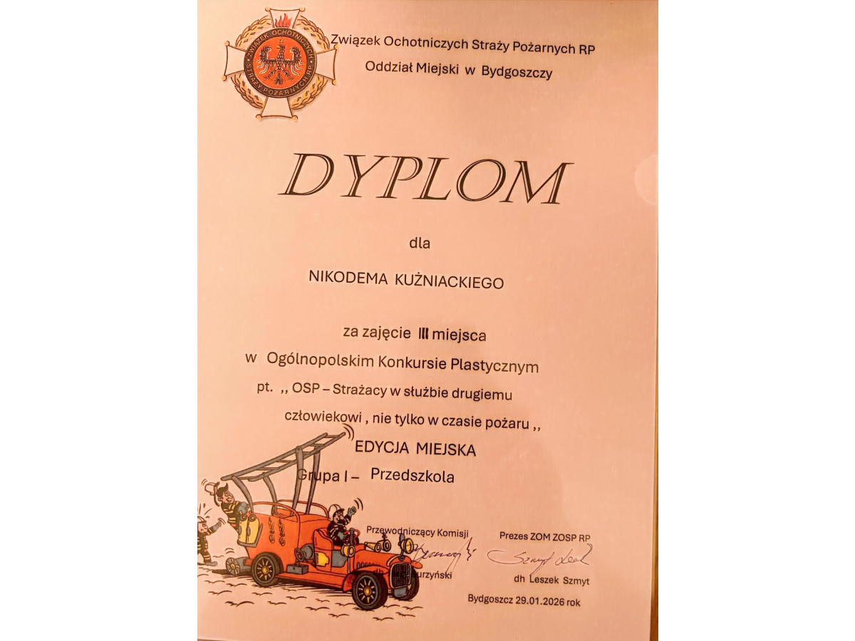 Nasze przedszkolaki przygotowały ciekawe prace plastyczne, które wzięły udział w Ogólnopolskim Konkursie Plastycznym pt. "OSP - Strażacy w służbie drugiemu człowiekowi, nie tylko w czasie pożaru" (w załączniku zamieszczamy oficjalne podziękowanie dla naszej placówki od organizatorów konkursu). W edycji miejskiej III miejsce zajął Nikodem Kuźniacki z grupy "Krasnale", a tym samym jego praca zakwalifikowała się do etapu wojewódzkiego konkursu. Gratulujemy!