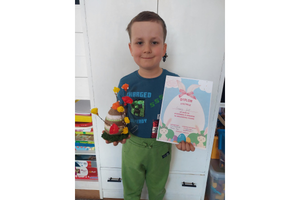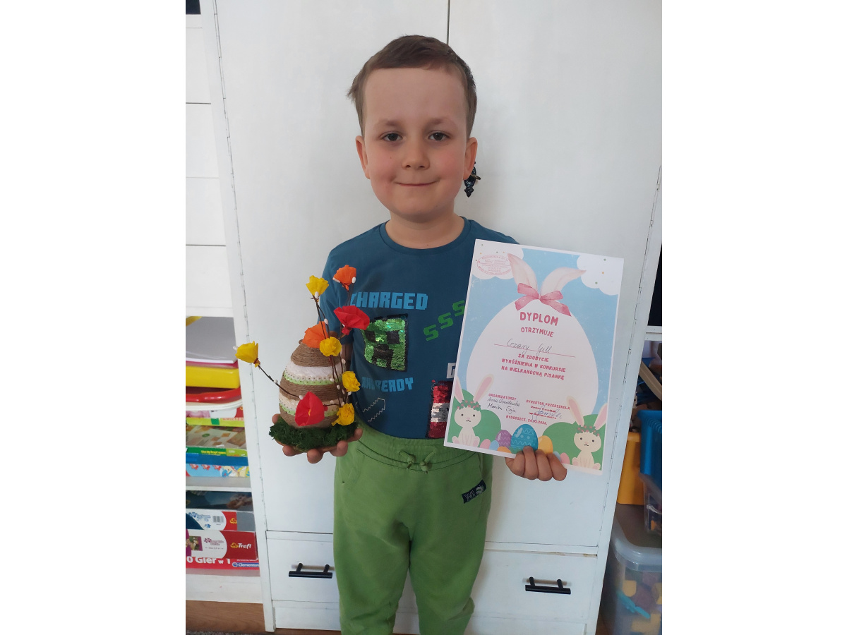 Gratulujemy Czarkowi z grupy "Motylki", który wraz z Mamą zdobył wyróżnienie w rodzinnym konkursie plastycznym pn. "Wielkanocna pisanka". Życzymy dalszych sukcesów!